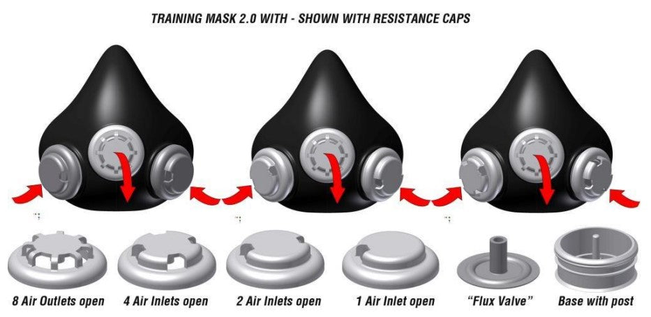 Training Mask 2.0 allows for the user to change resistance levels by adjusting the caps with multiple resistance levels.